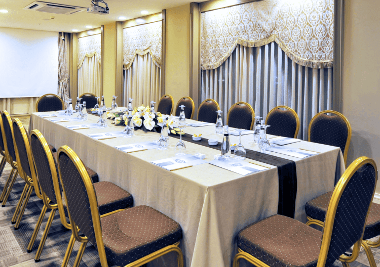 The Topkapı Meeting Room located in our sister hotel Yaşmak Sultan offers every detail to satisfy every need of our guests in their meetings or events of any kind. Topkapı Meeting Room includes multimedia facilities like a sound system, CD player, flipchart, projector, laser pointer, inline/outline telephone, microphone systems, Internet TV, whiteboard, and free wifi for all your guests during the event. Topkapı Meeting Room allows you to organize events for 30 people in U-shape and classroom-style seating, 36 people with a long table seating for conferences, 40 people with banquets, 50 people in theatre-style seating, and 60 people for cocktail organizations at a historical yet central location in the heart of old Istanbul. Also, you can enjoy our catering service to add coffee and snack breaks to your event.